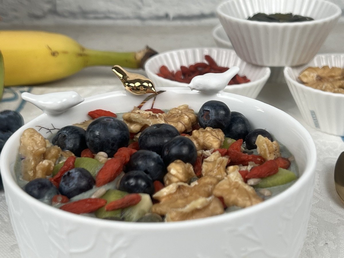 Pensata per la colazione o una merenda funzionale, questa bowl è un concentrato di macro e micronutrienti: oltre a quanto vi ho raccontato di mirtilli e alga spirulina, ci trovate anche le proteine dallo yogurt greco, zuccheri naturali dalla frutta, fibre e grassi buoni da semi e frutta secca. Tutti gli ingredienti sono naturalmente privi di glutine, e l’equilibrio tra carboidrati, proteine e fibra rende questa bowl una scelta ideale anche per chi è affetto da diabete di tipo 1.